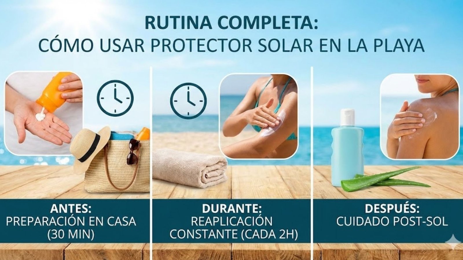 Una vez en la playa, tu rutina de protección solar debe ser activa y constante. Aquí es donde muchas personas fallan, asumiendo que la aplicación matutina es suficiente.